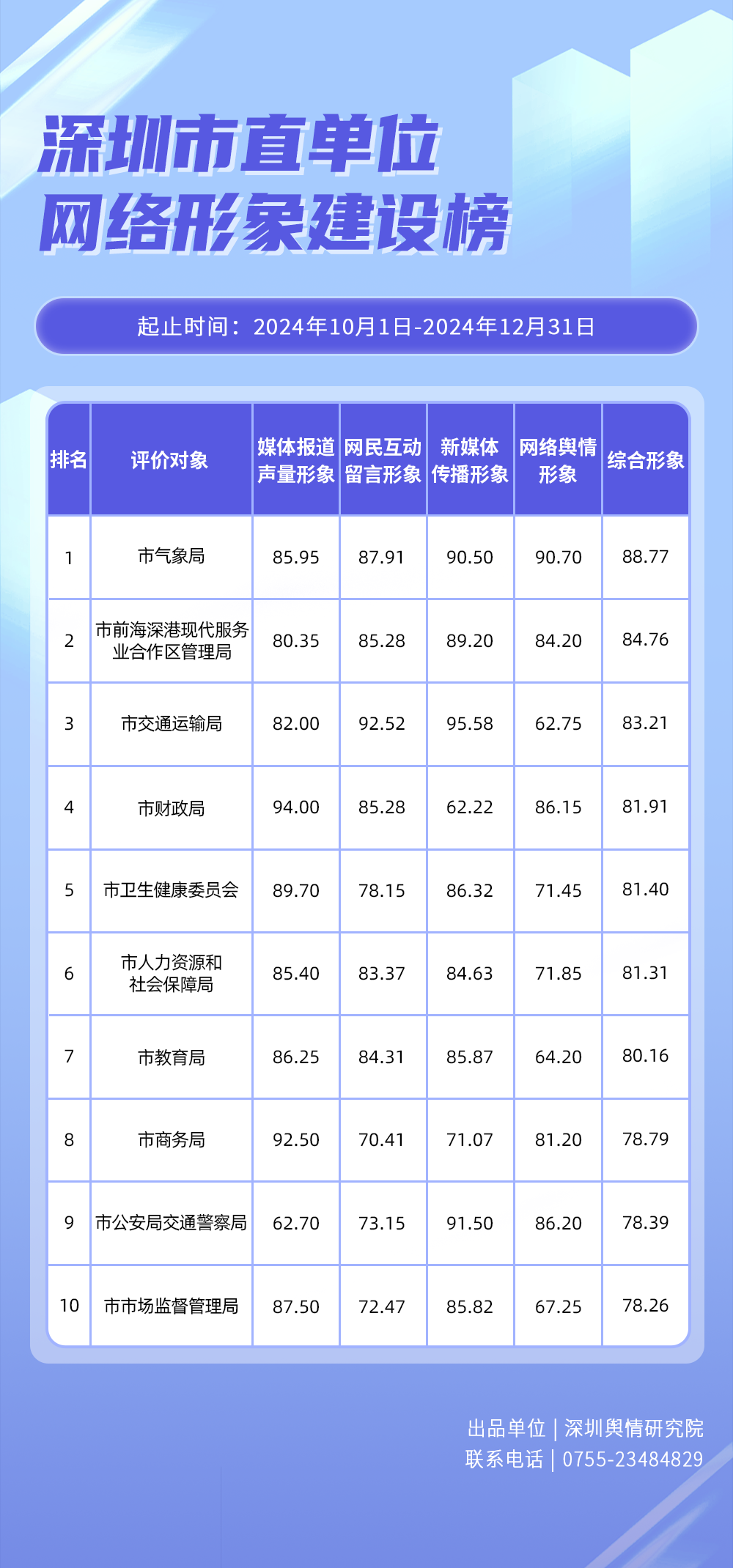 10-12月,市氣象局、市前海深港現(xiàn)代服務(wù)業(yè)合作區(qū)管理局、市交通運(yùn)輸局、市財(cái)政局、市衛(wèi)生健康委員會(huì)、市人力資源和社會(huì)保障局、市教育局、市商務(wù)局、市公安局交通警察局、市市場監(jiān)督管理局在網(wǎng)絡(luò)形象建設(shè)工作方面表現(xiàn)相對突出,登上《深圳市直單位網(wǎng)絡(luò)形象建設(shè)榜》。其中,市氣象局、市前海深港現(xiàn)代服務(wù)業(yè)合作區(qū)管理局、市交通運(yùn)輸局憑借其卓越的網(wǎng)絡(luò)形象建設(shè)工作,成功躋身前列,體現(xiàn)出高水平的網(wǎng)絡(luò)形象管理能力,展現(xiàn)了市直單位在新媒體時(shí)代下的責(zé)任與擔(dān)當(dāng),為構(gòu)建和諧社會(huì)環(huán)境貢獻(xiàn)了積極力量。
