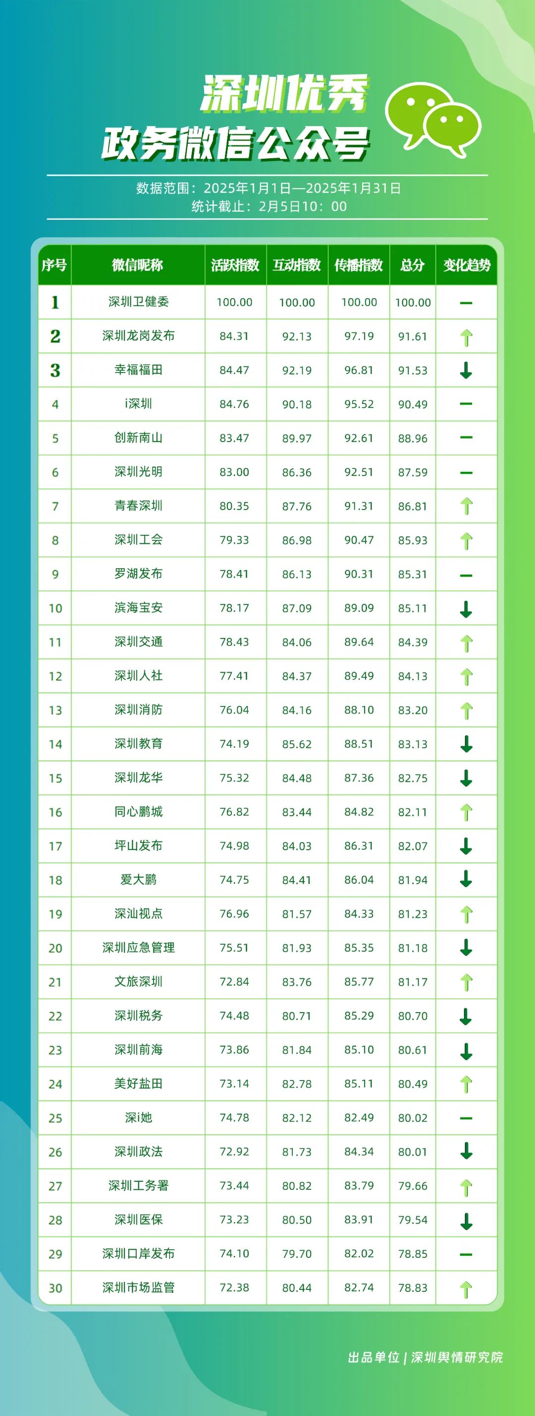 1月,“深圳衛(wèi)健委”“深圳龍崗發(fā)布”“幸福福田”“i深圳”“創(chuàng)新南山”“深圳光明”“青春深圳”“深圳工會”“羅湖發(fā)布”“濱海寶安”等30個賬號入選“深圳優(yōu)秀政務微信公眾號”。其中,“深圳衛(wèi)健委”各方面表現(xiàn)卓越,位于榜單首位,獲得總分100分?!吧钲邶垗彴l(fā)布”“青春深圳”“深圳工會”排名在本期有所提升,反映了這些賬號在內(nèi)容創(chuàng)新與受眾互動方面的不懈努力?!癷深圳”“創(chuàng)新南山”“深圳光明”“羅湖發(fā)布”則保持了穩(wěn)健的排名,持續(xù)在政務信息的傳播中扮演著不可或缺的角色。