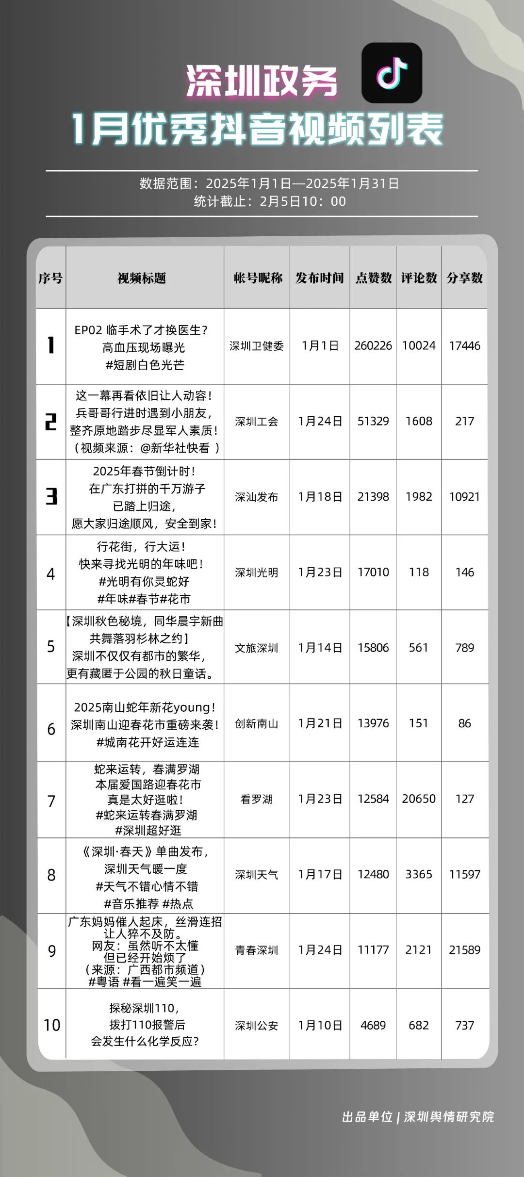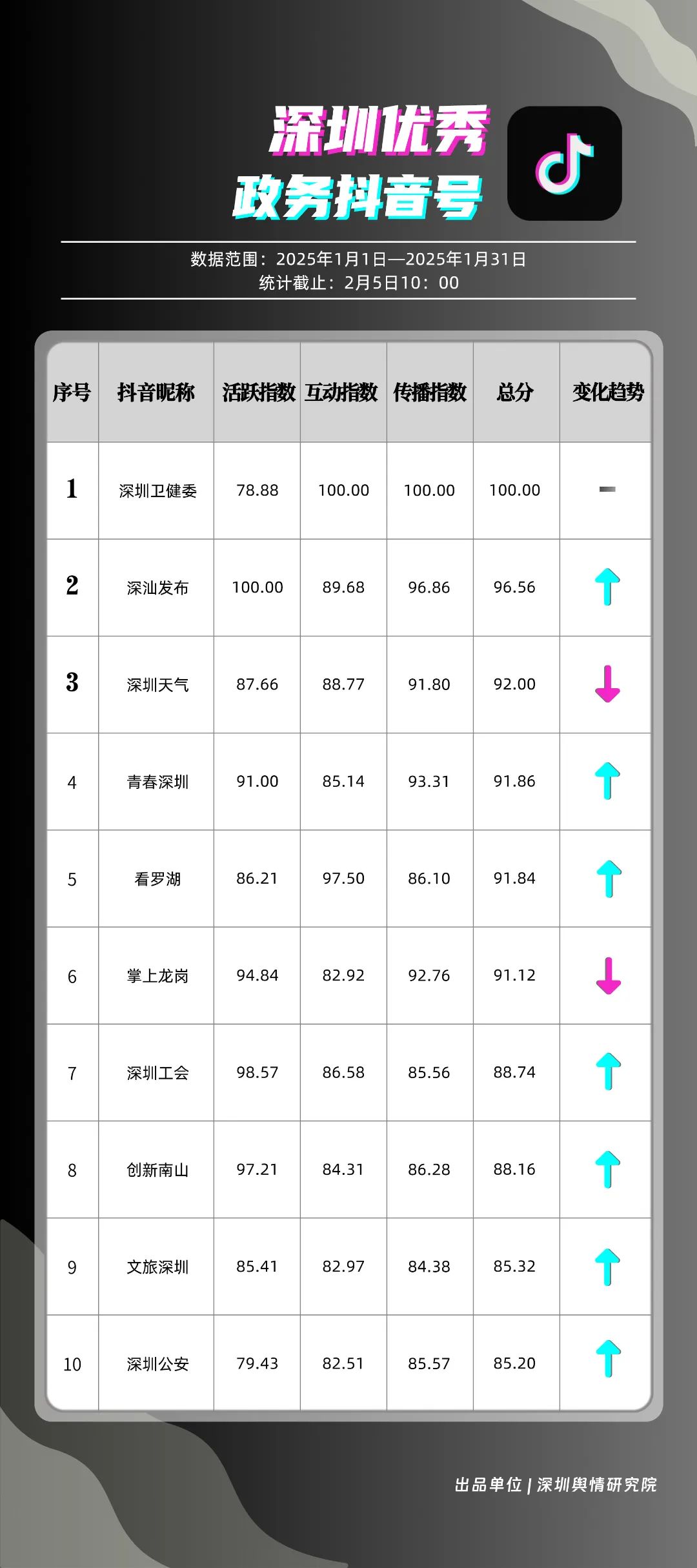 1月,“深圳衛(wèi)健委”“深汕發(fā)布”“深圳天氣”“青春深圳”“看羅湖”“掌上龍崗”“深圳工會”“創(chuàng)新南山”“文旅深圳”“深圳公安”共10個政務抖音號獲得“深圳優(yōu)秀政務抖音號”稱號。“深圳衛(wèi)健委”“深汕發(fā)布”“深圳天氣”成績優(yōu)異,綜合實力較強,位于榜單前列。“青春深圳”“看羅湖”等賬號排名有所提升,彰顯了這些賬號在拓寬受眾基礎、增強用戶黏性等方面所取得的積極成效。