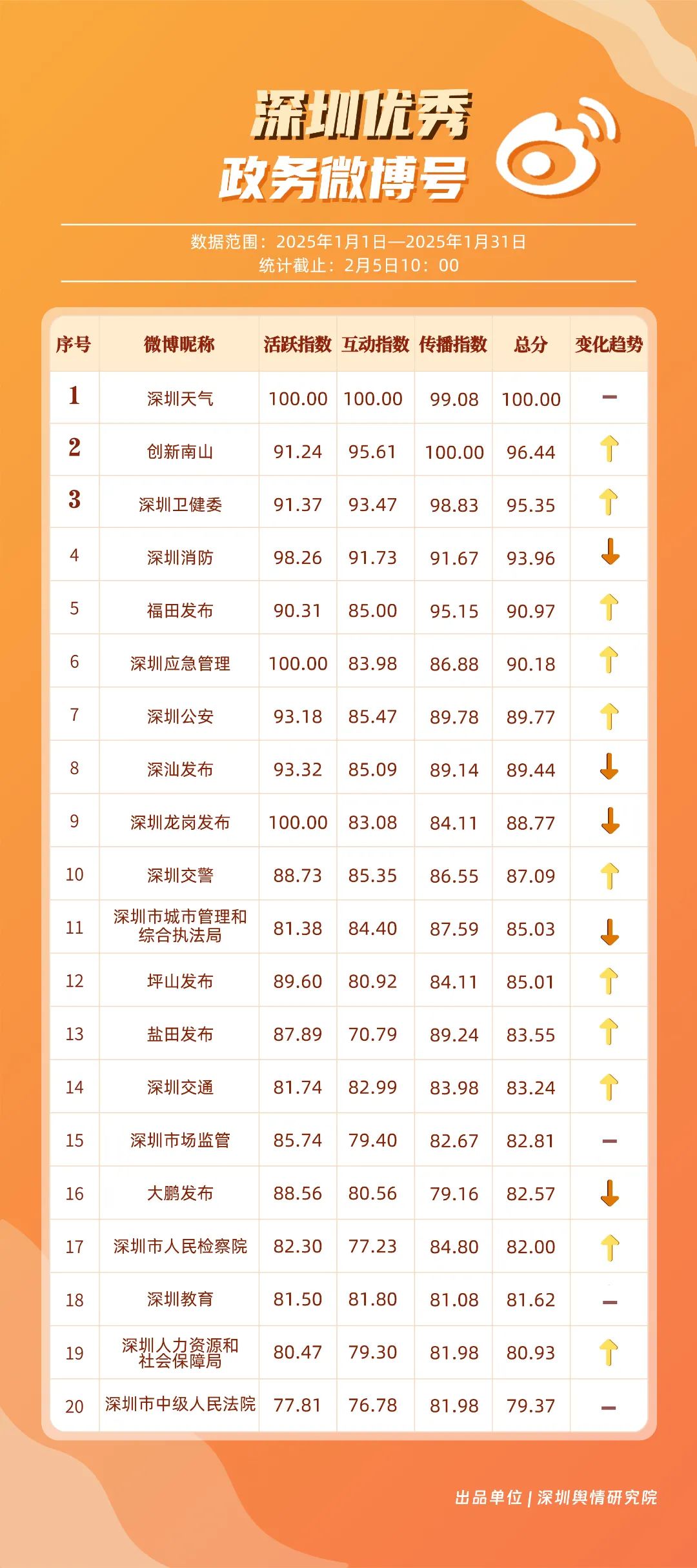 1月,“深圳天氣”“創(chuàng)新南山”“深圳衛(wèi)健委”“深圳消防”“福田發(fā)布”“深圳應急管理”“深圳公安”“深汕發(fā)布”“深圳龍崗發(fā)布”“深圳交警”等20個賬號入選“優(yōu)秀政務微博號”。“深圳天氣”憑借高活躍度、互動量等獲得滿分,“創(chuàng)新南山”“深圳衛(wèi)健委”賬號則在1月發(fā)力宣傳,排名上升至榜單第二、三位。同時,“深圳消防”“福田發(fā)布”“深圳應急管理”賬號總分在90分以上,彰顯了他們在提升公眾安全意識、促進政民互動等方面所做出的積極貢獻。