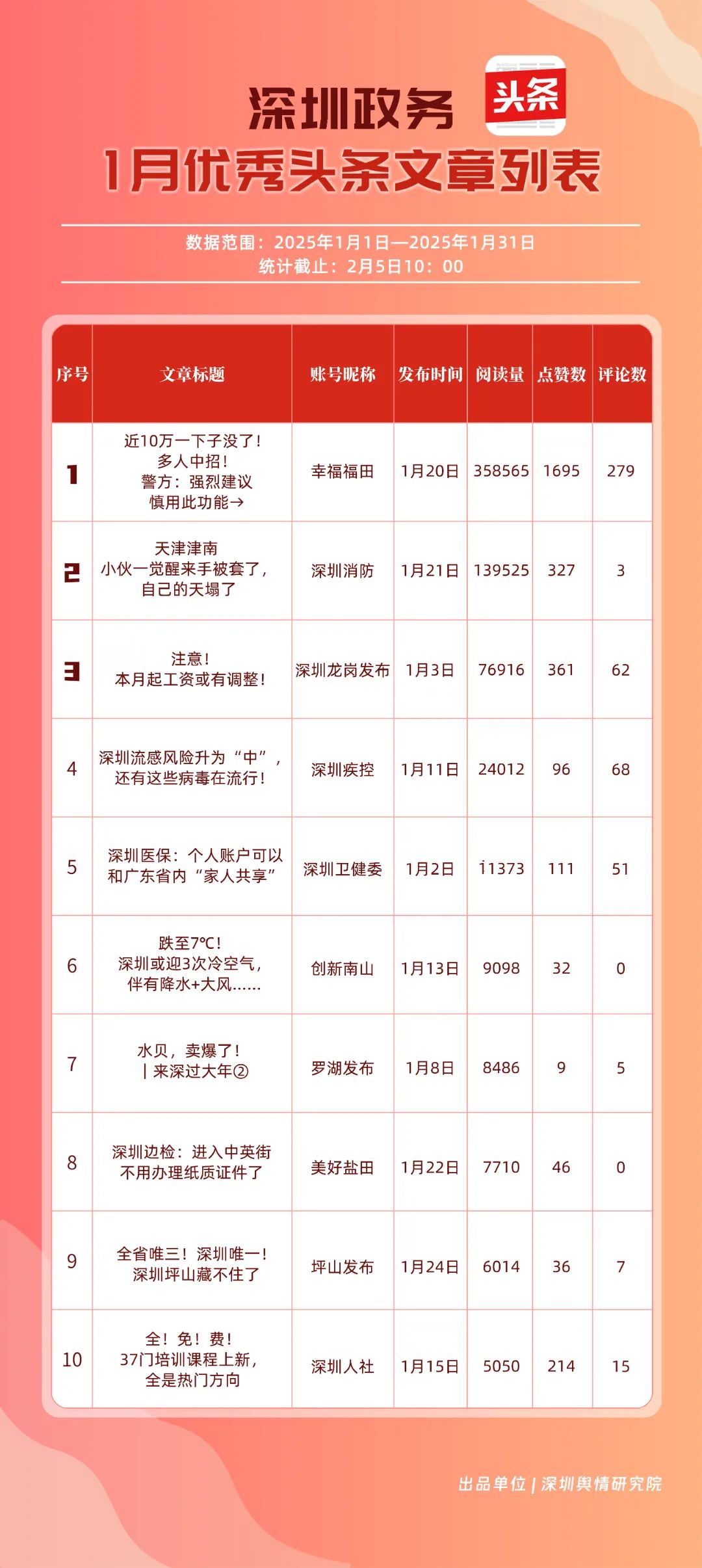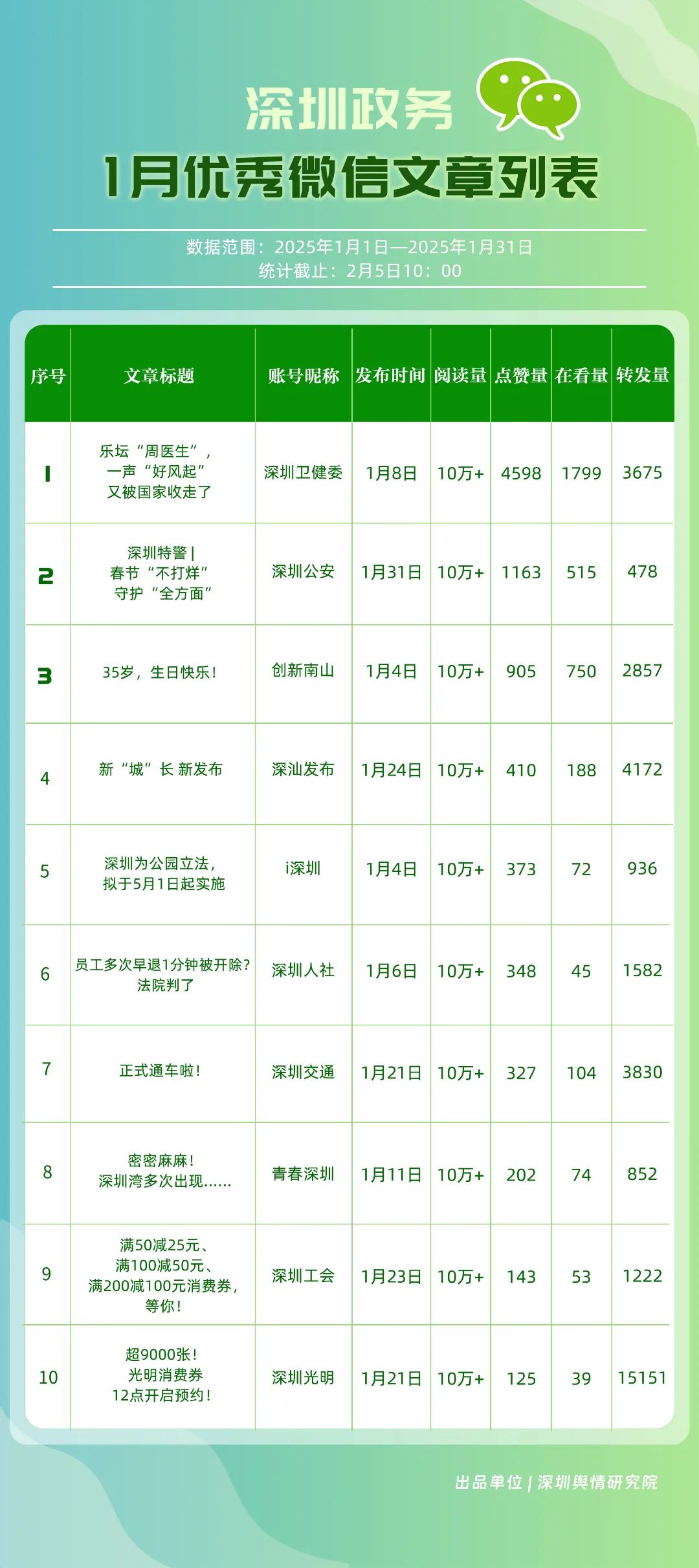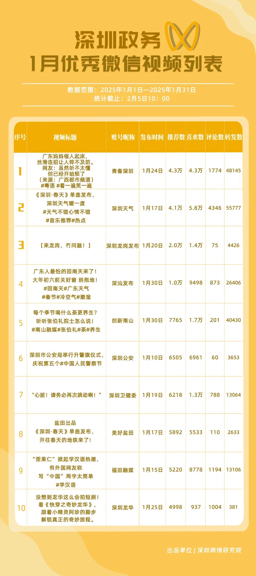 2025年1月期《深圳優(yōu)秀政務新媒體矩陣》發(fā)布,一同揭曉哪些政務新媒體矩陣能夠憑借其卓越表現(xiàn)脫穎而出,成為推動政務信息傳播與服務模式創(chuàng)新的領航者,引領政務新媒體運營邁向新高度。