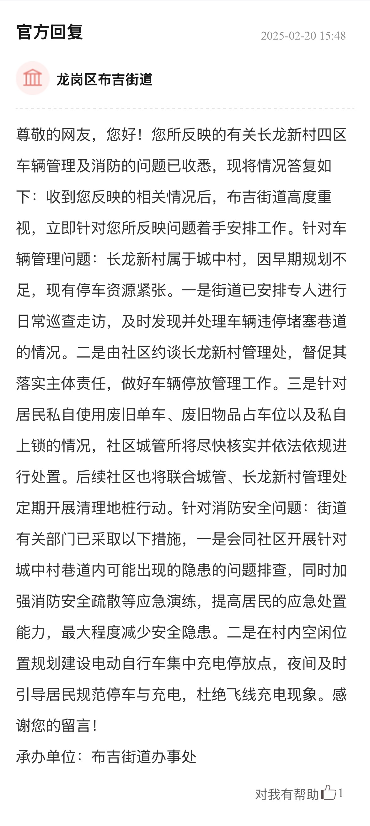 案例點(diǎn)評(píng):街道辦針對(duì)車(chē)輛管理、消防問(wèn)題多管齊下,旨在營(yíng)造一個(gè)通暢、安全的出行和生活環(huán)境,態(tài)度值得肯定。回應(yīng)展示了街道辦構(gòu)建的“專(zhuān)項(xiàng)巡查+設(shè)施建設(shè)+行為引導(dǎo)”綜合治理體系,精準(zhǔn)直擊問(wèn)題核心,兼顧當(dāng)下整治與長(zhǎng)遠(yuǎn)規(guī)劃,切實(shí)保障居民居住和生活安全,其系統(tǒng)性解決思路對(duì)同類(lèi)區(qū)域治理具有重要參考價(jià)值。