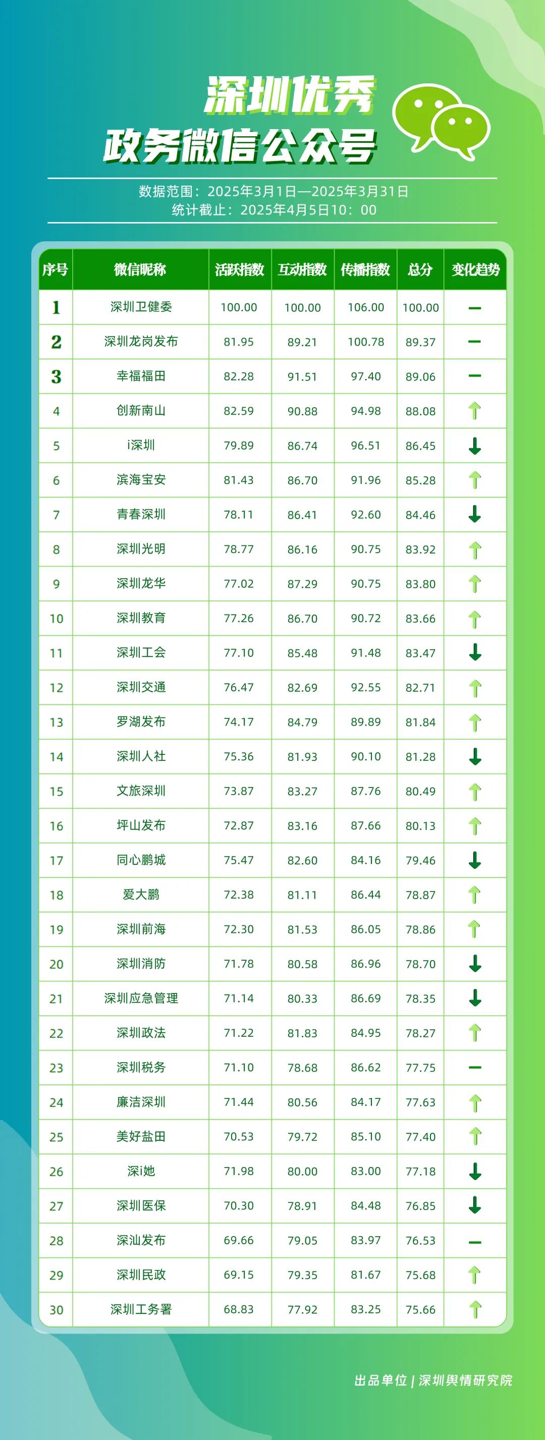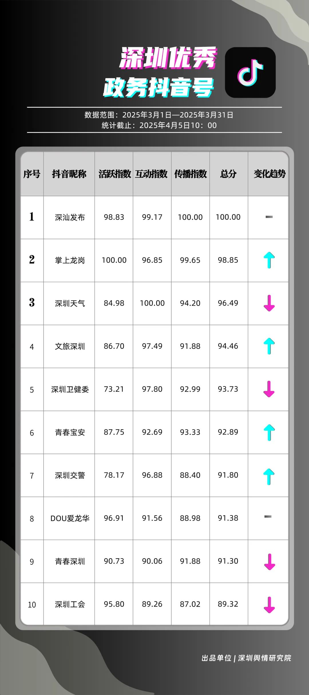 3月,市衛(wèi)生健康委、龍崗區(qū)、市氣象局、深汕特別合作區(qū)、南山區(qū)、福田區(qū)、市應(yīng)急管理局、龍華區(qū)、寶安區(qū)、光明區(qū)榮登“深圳優(yōu)秀政務(wù)新媒體矩陣”榜單。3月,市衛(wèi)生健康委新媒體矩陣持續(xù)關(guān)注市民身心健康,發(fā)布健康科普內(nèi)容,穩(wěn)居榜單第一位;龍崗區(qū)新媒體矩陣在抖音、微信視頻號(hào)平臺(tái)發(fā)力宣傳,躍居榜單第二位;市氣象局新媒體矩陣在微博平臺(tái)連續(xù)多期獲得滿分,持續(xù)以氣象預(yù)警與生活指南結(jié)合的內(nèi)容模式,為市民帶來(lái)便利信息。以上賬號(hào)在“深圳優(yōu)秀政務(wù)新媒體矩陣”榜單中榮獲前三名。此外,深汕特別合作區(qū)新媒體矩陣積極發(fā)布網(wǎng)絡(luò)熱點(diǎn)內(nèi)容,收獲較多網(wǎng)民關(guān)注分享;南山區(qū)新媒體矩陣多平臺(tái)實(shí)力強(qiáng)勁,以88.37分居于榜單第五位。值得關(guān)注的是,寶安區(qū)新媒體矩陣時(shí)隔多期躋身榜單前十名,多平臺(tái)均衡發(fā)展成效初顯。
