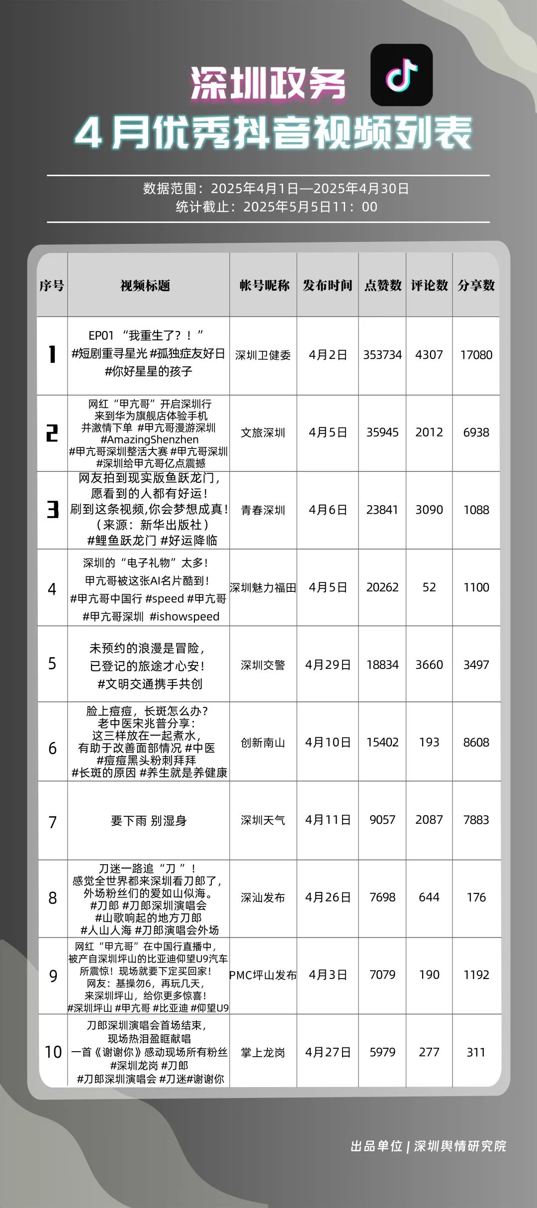4月,“深圳衛(wèi)健委”“文旅深圳”“青春深圳”“深圳天氣”“深汕發(fā)布”“掌上龍崗”“深圳魅力福田”“深圳交警”“創(chuàng)新南山”“DOU愛龍華”共10個政務抖音號獲得“優(yōu)秀政務抖音號”稱號。4月,“深圳衛(wèi)健委”“文旅深圳”“青春深圳”憑借新穎的內容策劃、生動的短視頻呈現(xiàn)方式,實現(xiàn)排名提升,位居榜單前三?!吧钲谔鞖狻薄吧钌前l(fā)布”緊隨其后,以優(yōu)質實用的內容、接地氣的表達,持續(xù)擴大政務新媒體的傳播聲量。上榜賬號積極探索創(chuàng)新傳播路徑,以生動有趣的方式傳遞政務信息,為深圳政務新媒體在短視頻領域的發(fā)展注入新活力。