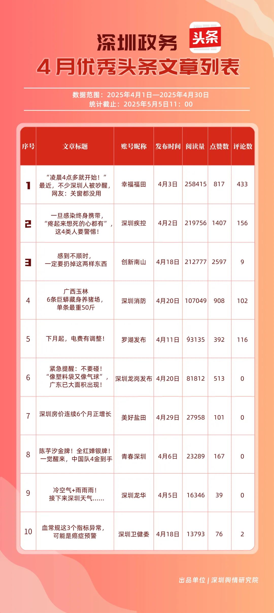 4月,“幸福福田”“深圳疾控”“創(chuàng)新南山”“深圳消防”“羅湖發(fā)布”“深圳龍崗發(fā)布”“坪山發(fā)布”“深圳龍華”“青春深圳”“濱海寶安”共10個政務頭條號入選“優(yōu)秀政務頭條號”榜單?!靶腋8L铩毖永m(xù)上月的優(yōu)異表現(xiàn),以優(yōu)質的內容輸出和穩(wěn)定的用戶互動,位列榜單首位,成為政務頭條號的標桿;“深圳疾控”則以92.39分的亮眼成績排在榜單第二位,凸顯了政務新媒體在公共衛(wèi)生領域的傳播成果;“創(chuàng)新南山”“深圳消防”“羅湖發(fā)布”緊隨其后,分別在城區(qū)形象宣傳、消防安全領域等方面深耕細作,持續(xù)擴大政務信息的覆蓋面與影響力。