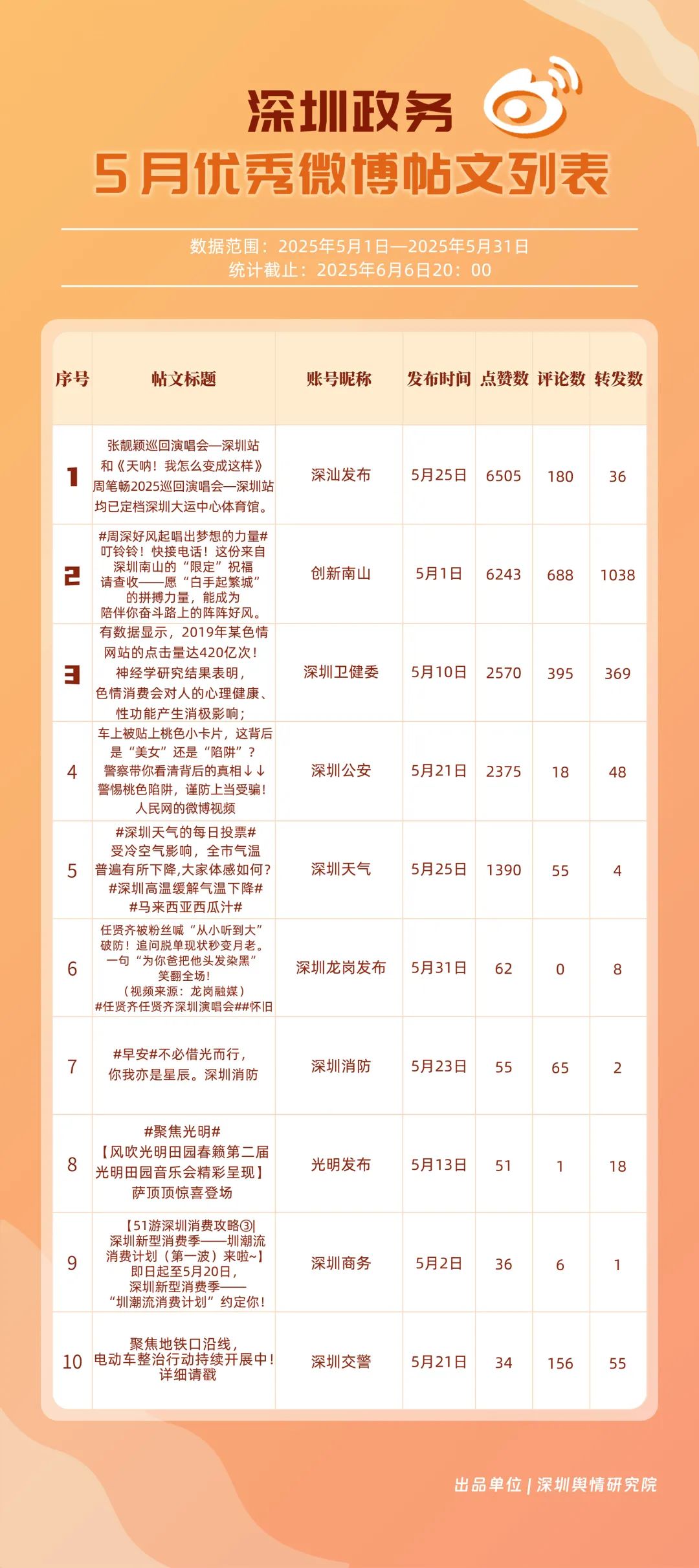 5月,“深圳天氣”“創(chuàng)新南山”“深圳衛(wèi)健委”“深圳消防”“深圳應(yīng)急管理”“深汕發(fā)布”“深圳公安”“深圳龍崗發(fā)布”“深圳交警”“福田發(fā)布”等20個(gè)賬號(hào)入選“優(yōu)秀政務(wù)微博號(hào)”。其中,“深圳天氣”憑借活躍指數(shù)和互動(dòng)指數(shù)雙項(xiàng)滿分的亮眼成績(jī),穩(wěn)居榜單首位?!皠?chuàng)新南山”以95.96分緊隨其后,在互動(dòng)、傳播指數(shù)得分大幅提升,排名實(shí)現(xiàn)顯著躍升?!吧钲谛l(wèi)健委”“深圳消防”“深圳應(yīng)急管理”也表現(xiàn)卓越,總分均超過(guò)90分,它們憑借權(quán)威信息發(fā)布、專業(yè)知識(shí)科普,展現(xiàn)了各單位在民生服務(wù)、公共安全領(lǐng)域的重要作用。以上優(yōu)秀政務(wù)微博號(hào)深度契合平臺(tái)的傳播特征,善于借助熱門話題擴(kuò)大影響力,以鮮明的賬號(hào)特色展現(xiàn)區(qū)域風(fēng)采。