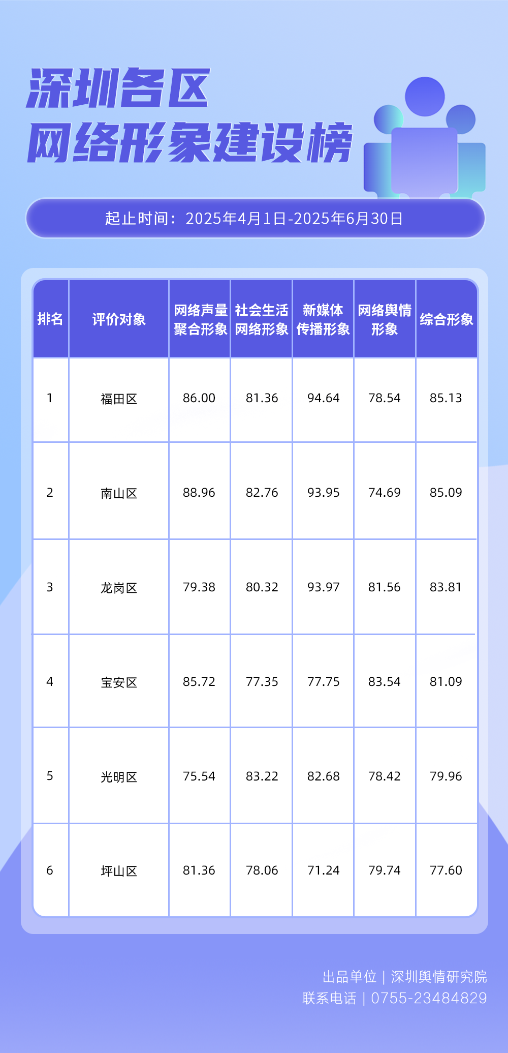4-6月,《深圳各區(qū)社會(huì)生活網(wǎng)絡(luò)形象榜》中,光明區(qū)憑借在居住、醫(yī)療、出行等多方面的良好網(wǎng)絡(luò)呈現(xiàn),獲得較高綜合評(píng)價(jià)分值,南山區(qū)、福田區(qū)、龍崗區(qū)也表現(xiàn)優(yōu)異,四區(qū)綜合評(píng)價(jià)分值均超80分。大鵬新區(qū)、深汕特別合作區(qū)也在榜單中占據(jù)靠前位置,成為各區(qū)借助網(wǎng)絡(luò)力量增進(jìn)民生福祉、推動(dòng)協(xié)調(diào)發(fā)展的生動(dòng)展現(xiàn)。