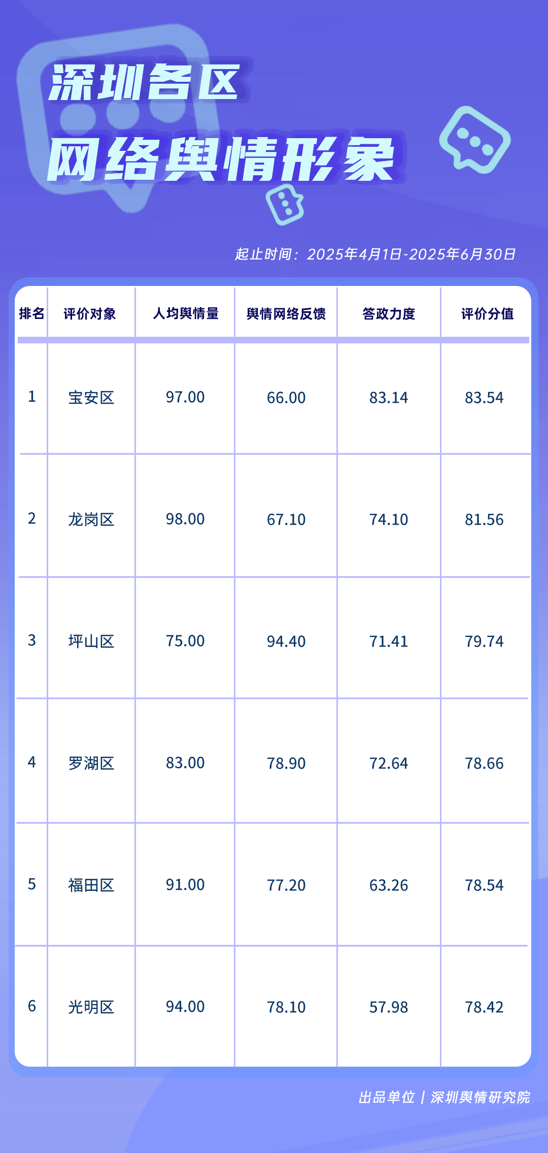 4-6月,在網(wǎng)絡(luò)輿情方面,寶安區(qū)、龍崗區(qū)憑借較低的人均輿情量、較好的答政效果,位居榜單前二;坪山區(qū)、羅湖區(qū)、福田區(qū)、光明區(qū)也躋身前列,以優(yōu)異分?jǐn)?shù)展現(xiàn)其在網(wǎng)絡(luò)輿情工作中的積極成效,彰顯了各區(qū)在營造良好網(wǎng)絡(luò)輿情環(huán)境、及時(shí)回應(yīng)網(wǎng)民訴求上的主動(dòng)擔(dān)當(dāng)。