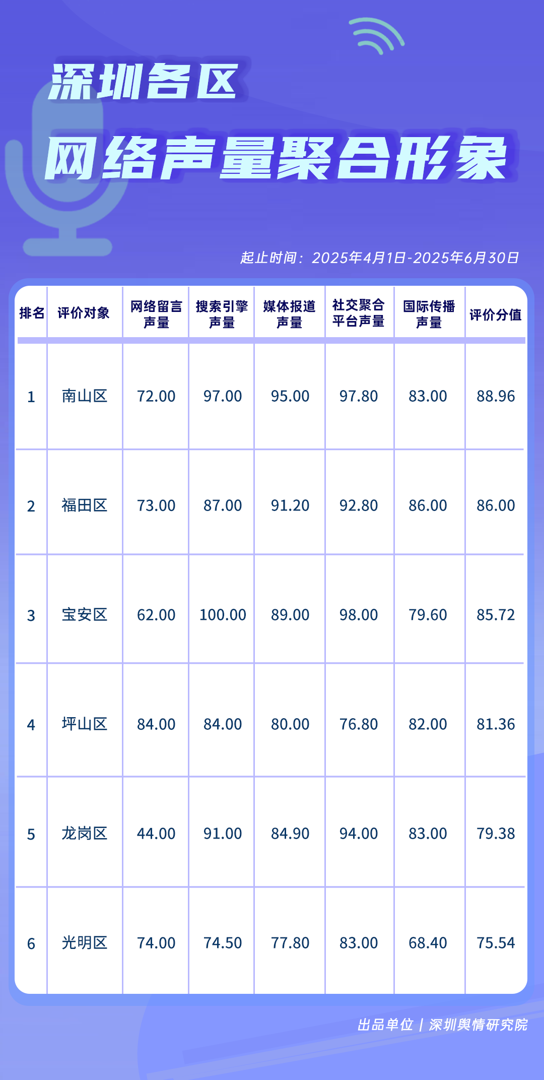 4-6月,《深圳各區(qū)網(wǎng)絡(luò)聲量聚合形象榜》中,南山區(qū)憑借各項(xiàng)聲量指標(biāo)的優(yōu)異表現(xiàn),以88.96分榮登榜首,福田區(qū)、寶安區(qū)緊隨其后,在搜索引擎聲量、媒體報(bào)道聲量等指標(biāo)上均斬獲高分,反映出市民及媒體對(duì)區(qū)域給予較高關(guān)注。坪山區(qū)、龍崗區(qū)、光明區(qū)也位居前列,表現(xiàn)不俗,為提升城市數(shù)字治理能級(jí)注入了源源不斷的動(dòng)力。