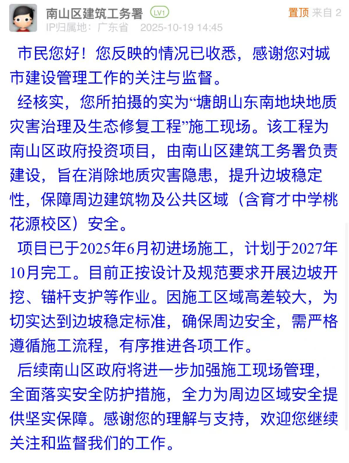 案例點(diǎn)評(píng):針對(duì)市民疑慮,相關(guān)部門的回應(yīng)展現(xiàn)出“透明化+精細(xì)化”的治理思路:第一時(shí)間明確工程屬性并同步告知工期安排,主動(dòng)消解市民對(duì)工程進(jìn)展的不確定性擔(dān)憂;同時(shí),南山區(qū)建筑工務(wù)署還表示后續(xù)將進(jìn)一步加強(qiáng)現(xiàn)場(chǎng)管理,回應(yīng)關(guān)切。這種回應(yīng)思路既解決了市民的困惑,也通過可感知的舉措傳遞了對(duì)安全的重視態(tài)度,是城市工程類訴求處置中“信息公開”“風(fēng)險(xiǎn)閉環(huán)”的有效示范。